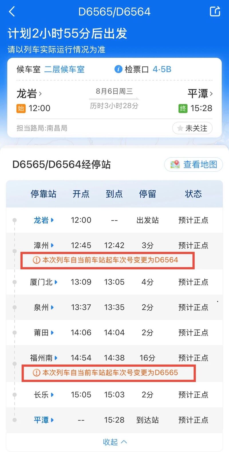 以由龙岩开往平潭的D6565/6564次列车为例:该趟列车从龙岩站始发时车次为D6565,自漳州站起变更为D6564,自福州南站起变更为D6565,总共经过2次变化。