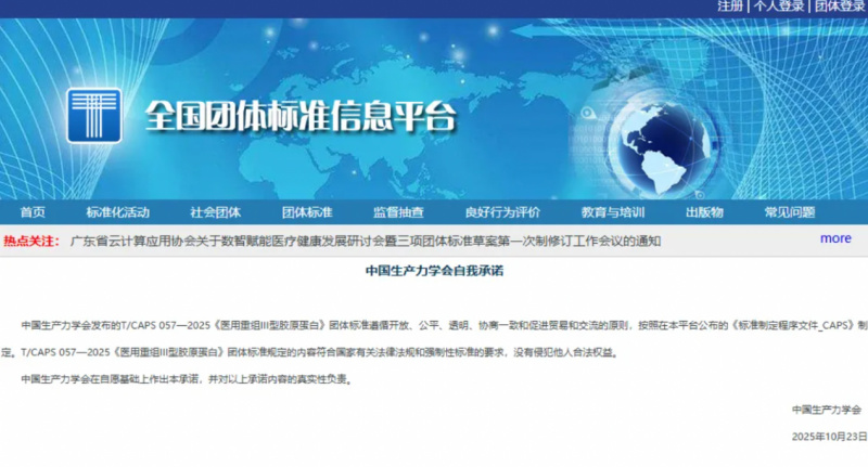 2025年10月20日我国生物医用材料领域迎来一项关键里程碑,备受业界关注的《医用重组Ⅲ型胶原蛋白》(T/CAPS 057—2025)团体标准正式实施。该标准由中国医学科学院皮肤病医院提出,中国生产力学会归口发布,旨在终结该领域长期“无标可依”的局面,为行业的规范化与高质量发展奠定了基石,同时也为医用重组Ⅲ型胶原蛋白在皮肤健康领域的应用注入强劲动力。