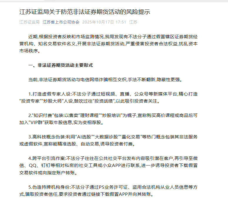江苏证监局提示:请广大投资者提高警惕,树立理性投资理念,增强风险防范意识,远离非法证券期货活动,切实保护自身财产安全。