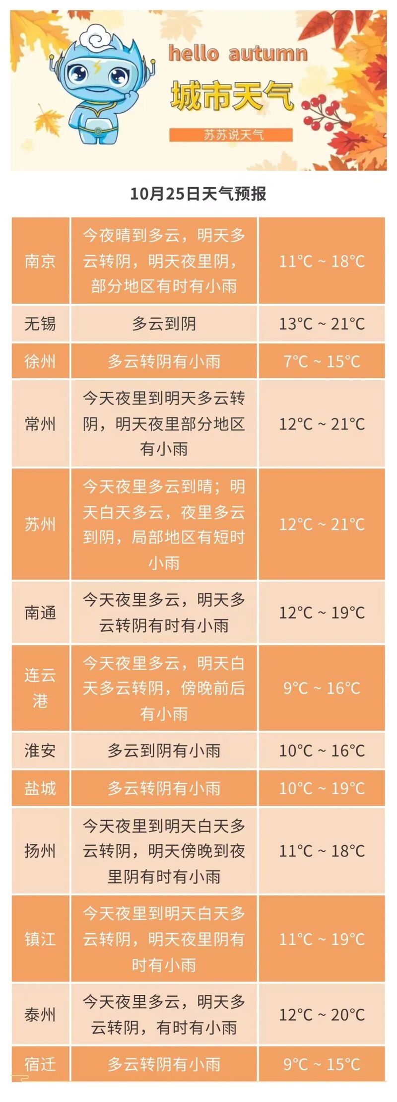 夜里全省晴转多云;白天长江以北地区阴有小雨,其他地区多云。最高温度:本省东南部地区20~21℃,本省西北部地区15℃左右,其他地区18℃左右;最低温度:淮北北部地区8~9℃,本省东南部地区12~13℃,其他地区11℃左右。全省偏北风4级左右。
