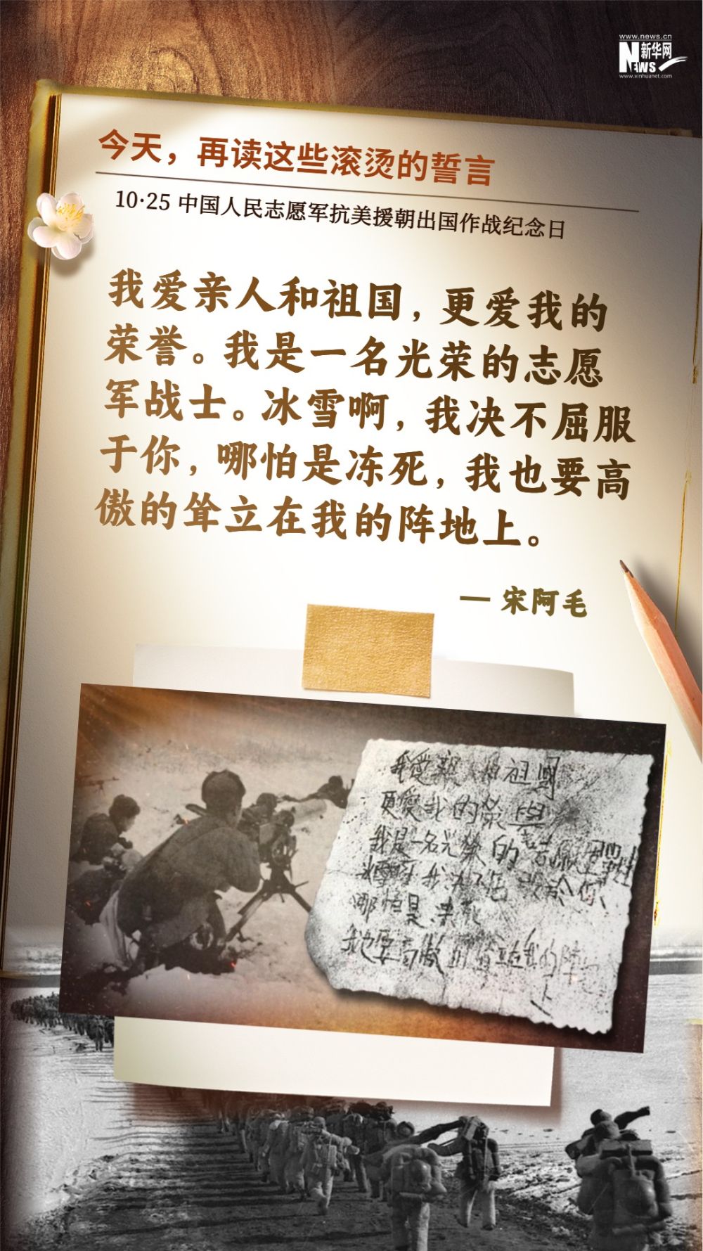 1950年11月28日深夜,长津湖战役打响的第二天,志愿军战士宋阿毛所在的第9兵团第20军59师177团6连负责防守美军从柳潭里撤往下碣隅里的必经之路死鹰岭高地,奉命在此配合第27军阻击南逃之敌。30日凌晨,兄弟部队的官兵发现敌人已于死鹰岭下顺利南逃,固守高地的6连官兵却未放一枪一炮。前来查看情况的参谋被眼前的景象惊得说不出话:那是一座座随时准备跃起冲锋的冰雕,6连战士们身着单衣呈战斗队形散开,潜伏在雪地之中,保持着手执武器的姿态,怒目注视着前方,坚守到生命的最后一刻。在整理烈士遗物时,战友们从宋阿毛的贴身口袋中发现了这封绝笔信。
