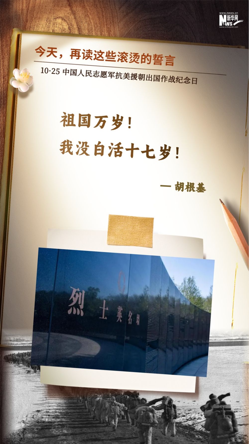 在沈阳抗美援朝烈士陵园的英烈墙上,有一位牺牲时年仅17岁的小战士胡根基。在打退敌人十次反冲锋后,他所在的班枪弹用尽,他们一人一颗手榴弹与敌人同归于尽。冲向敌群时,胡根基向班长喊出诀别:“祖国万岁!我没白活十七岁!”。牺牲前,他曾憧憬:“班长,我们要是有飞机大炮就好了,就可以把敌人赶下海去!”如今,在沈阳抗美援朝烈士陵园,他的战友来看他时,为他带来了东风-5C核导弹的照片,“我要告诉他,我们军队现代化突飞猛进,现在何止有飞机大炮,还有许多连我这个老兵都认不出的先进装备!”