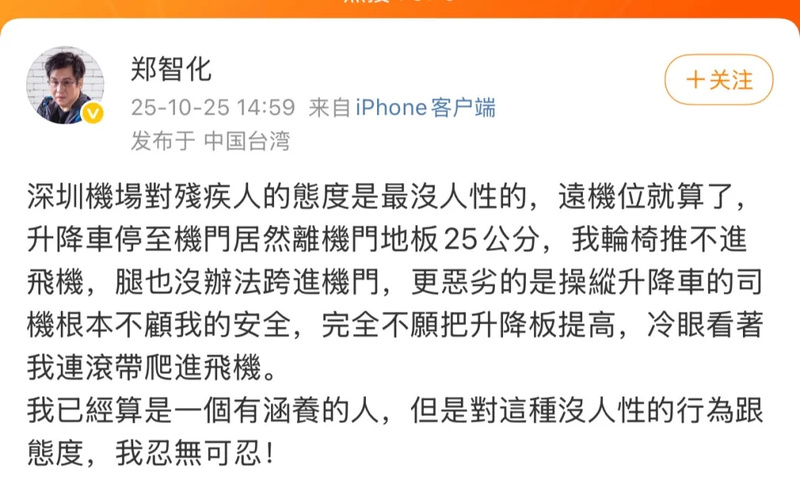 10月25日,歌手郑智化在微博发文表示,自己在深圳机场乘坐航班的时候,升降车升至机门后离机门地板有25厘米距离,导致其轮椅无法推入飞机。而操纵升降车的司机不愿把升降板提高,冷眼看着他“连滚带爬”进飞机。此事在网络上引起关注和热议。