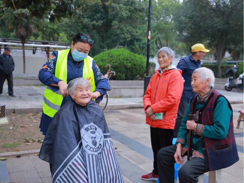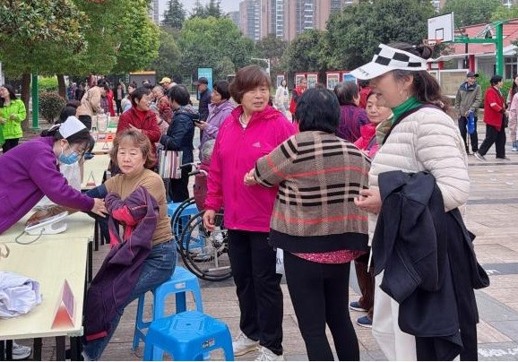 江苏省第二中医院内科第三党支部的医护志愿者坐镇义诊专区,为老年居民提供血压测量、慢性病咨询、用药指导等服务,针对秋冬季节老年常见疾病给出预防建议。磨刀台前,来自快递网点的志愿者李师傅接过老人递来的钝刀,熟练开启砂轮,“平时送件常受社区照顾,这次能帮老人磨磨刀,也算尽份力”;理发专区里,党员志愿者李师傅化身“临时理发师”,为老人修剪头发,赢得老人连连称赞。除了实用的便民服务,现场的趣味活动更让节日氛围愈发浓厚。套圈区域内,孩子们的欢呼与老人的笑声交织在一起;茱萸香囊DIY区里,志愿者与居民围坐一桌,共同将茱萸、艾草填入香囊,一针一线间传递着邻里温情。
