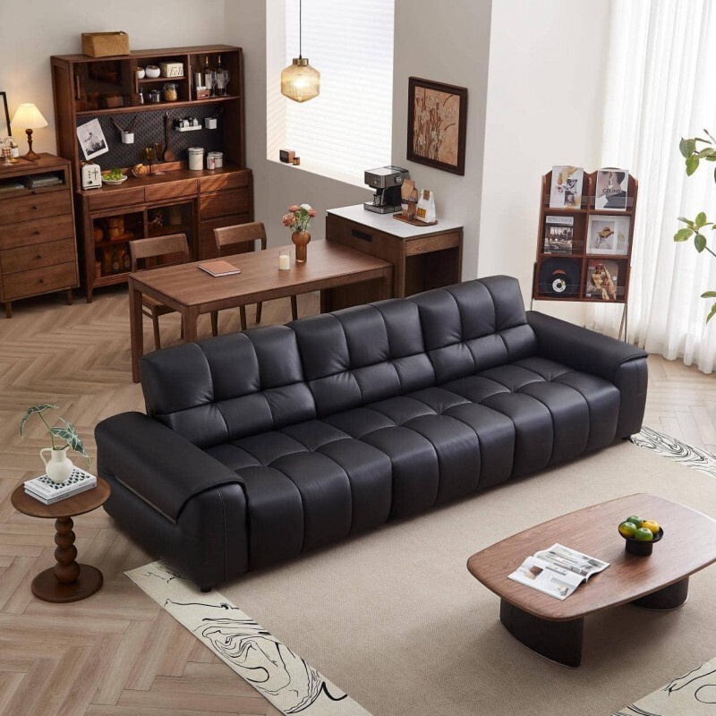 沙发面料选用加厚进口头层牛皮,经蜡光半青皮工艺处理,呈现细腻光泽,柔韧耐用。方格块设计搭配深邃黑配色,简约不失新意,尽显摩登时尚感。恒压高弹海绵填充座包、靠包、扶手,带来软弹包裹感,多层海绵复合分压,回弹性强,久坐久躺都不累。
