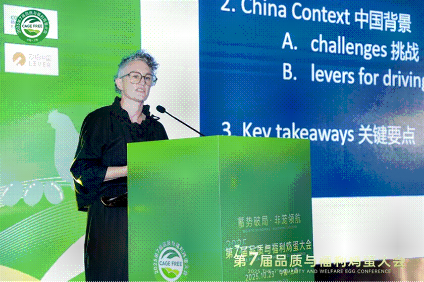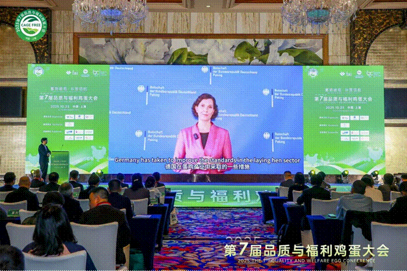 邓菲表示德国高度重视动物福利和可持续农业。她介绍,德国法律将动物保护纳入宪法,并禁止笼养蛋鸡及淘汰公雏,推广符合自然行为的饲养方式。德国还严格监管食品安全,每年对数十万批次食品进行农药、抗生素及其他有害物质检测。她强调推动动物福利与食品质量同样重要,期待通过此次会议促进行业可持续发展和高品质农业实践。