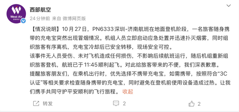10月27日,PN6333深圳-济南航班在地面登机阶段,一名旅客随身携带的充电宝突然出现冒烟情况。机组人员立即启动应急处置并迅速扑灭烟雾,同时组织旅客有序离机,充电宝冷却后已安全转移,现场安全可控。