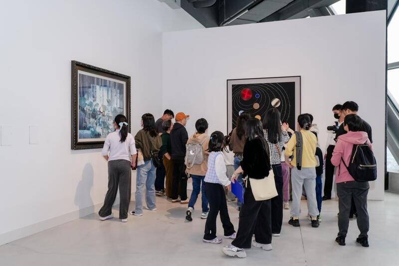 移步到“亭台·视界”展区,空间内正中央悬浮着的巨大的环形发光艺术装置,仿佛一轮皎洁的满月。站在这轮“满月”之下,一侧是姚涛创作的《运河十景》,一侧则是用“米粉”用小米手机记录下的美好瞬间,科技与美学的深层共鸣在此展开。