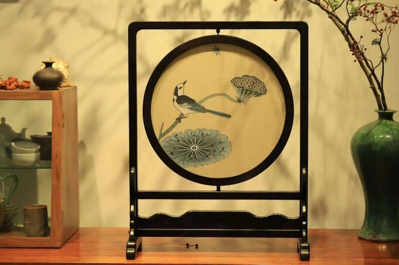此次展览汇聚了7位杰出艺术家的23件匠心之作,涵盖缂丝、竹刻、和田玉镶嵌、紫砂壶、刺绣香包、剪纸及猛犸象牙浅刻等多种技艺。其中,黄佳丽以缂丝技法创作的《晴蝶图》尤为惊艳,蝴蝶翅膀色彩斑斓如光影流动;其另一幅《疏荷沙鸟图》则巧妙运用正反双面织造技术,将秋日荷塘的静谧与灵动表现得淋漓尽致。陆颖怡带来的《金缕缀玉,永世芳菲》系列作品,融合和田玉与金丝细钻,华贵而典雅,为秋日增添一抹亮色。竹艺大师张琪的作品《云山观瀑》以竹代纸、以刀为笔,刻画出老者临瀑观景的山水意境;紫砂艺术家吴姬英的《桃韵》套组将提梁壶设计成桃枝造型,搭配杯具形成完整茶席,让人在品茗间感受江南秋韵。此外,现场还展出了《十二生肖》《蝴蝶璎珞》《莲花荷包》等刺绣香包作品,以及剪纸《蝶恋花和蝴蝶仙子》、猛犸象牙《荷韵》文房套组和《三羊开泰》插屏等精品,每一件都凝聚着匠人的巧思与传承。