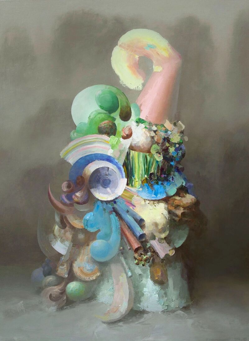 灵感来源很杂,有时来自现实,有时来自书或梦,有时只是一种情绪。我会用扎实的写实技法,把这些虚渺的感觉固定下来、变成具体的形象。比如《变形记》系列:先让色彩在画布上自由流淌,形成不同色块。某些色块看起来像小猫咪、母子俩或瓶瓶罐罐,然后把它细化,加上结构、明暗和投影,让它立体起来——不确定的部分,就继续调整,直到满意。