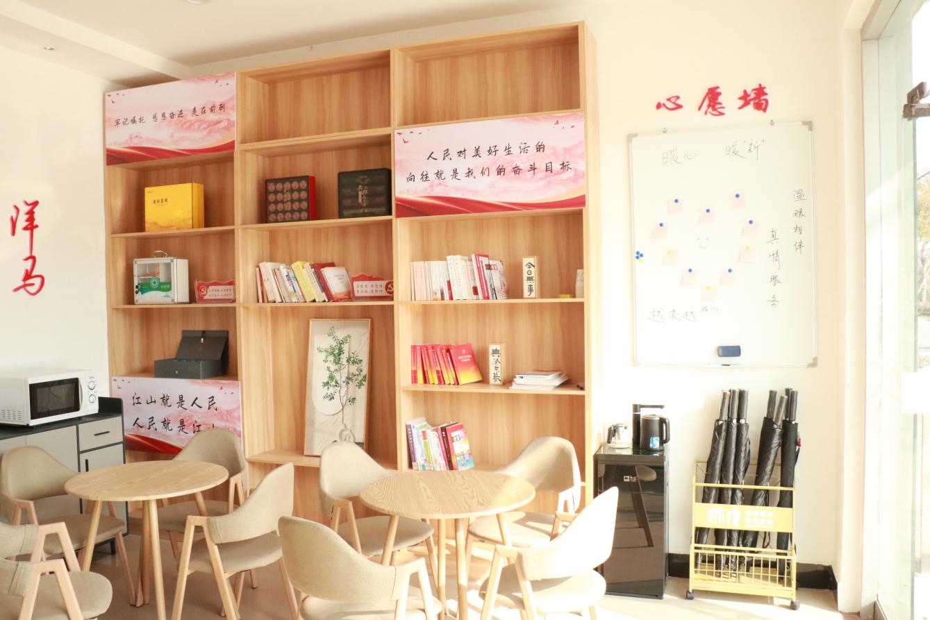 驿站虽仅十几平方米,功能却一应俱全。休息桌椅、微波炉、备药箱、雨具、充电设施等便民设备整齐排列,免费 Wi-Fi 随时可用,既满足户外工作者的日常需求,也方便菊花经纪人随时在线对接客户。更具特色的是“红色加油”站,陈列的党报党刊与红色书籍中,还穿插了农产品销售类图书。让休憩时光既是“精神充电”,也是“技能补给”,驿站会议室更成了产业交流阵地。