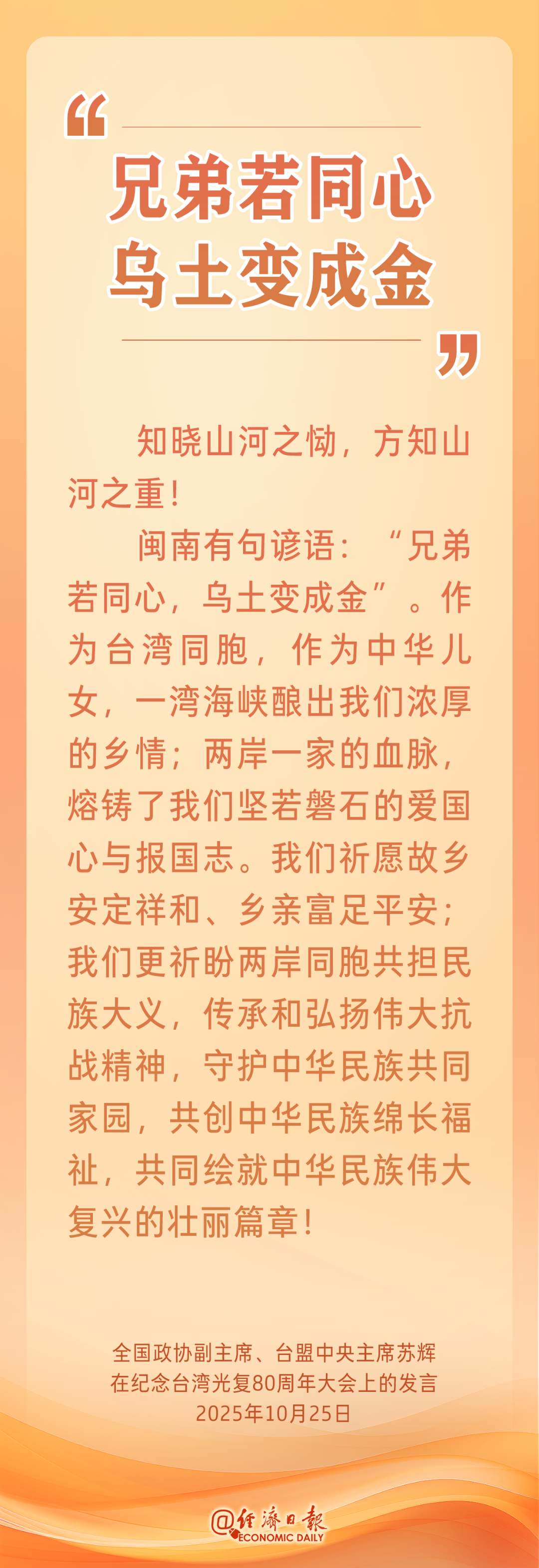 八秩春秋,山河重光。“台湾光复时,台湾百姓家家张灯结彩,欢呼雀跃重新回到祖国怀抱”,“台湾光复,何其铿锵,这是历史与正义的伟大胜利!台湾光复,何其壮烈,这是爱国主义精神的伟大胜利!台湾光复,何其炽热,这是民族觉醒的伟大胜利!”