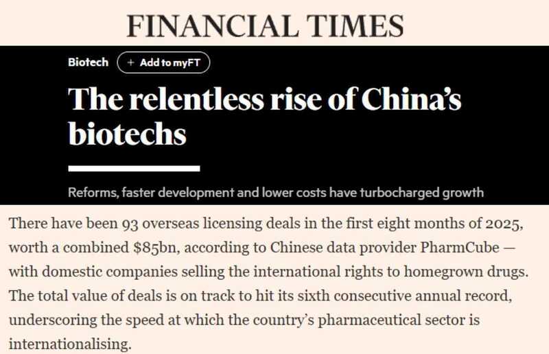 文章称,今年以来,中国生物科技企业出海交易数量创下历史新高。文章援引中国行业大数据服务提供商的统计数据称,今年前八个月中国生物科技企业达成的海外授权交易已达93笔,交易总额近850亿美元,交易总额有望连续第六年刷新历史纪录,这凸显出相关行业正以惊人速度实现国际化转型。业内人士表示,十年前,当时中国生物科技企业大多致力于仿制药研发,而如今,所有大型国际生物科技企业都在中国积极寻求创新疗法的合作机会。