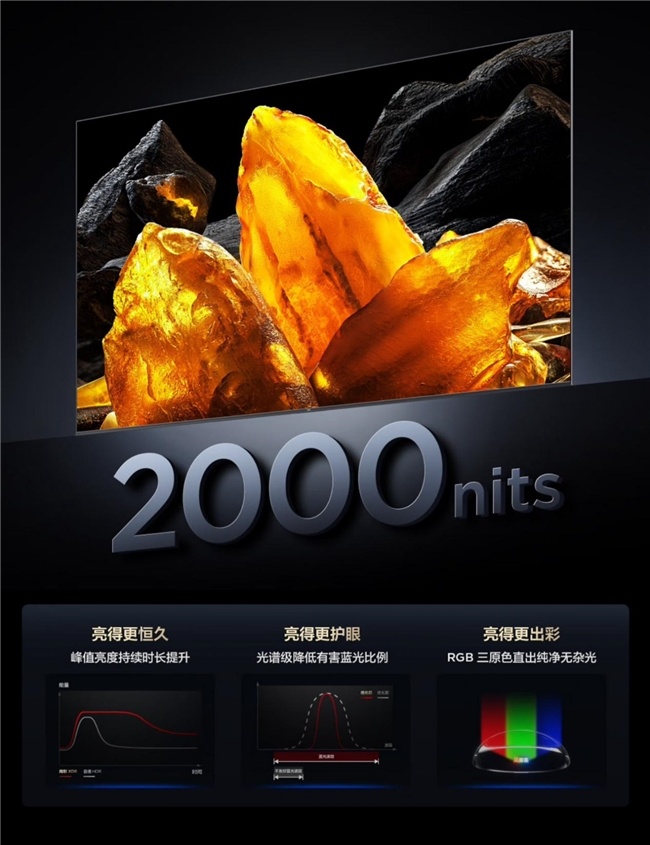 第三是画质表现的动态保障——绚彩XDR 2000nits峰值亮度。这项配置确保电视在呈现HDR内容时能展现更极致的明暗动态范围,配合精准的色彩管理,让画面既亮得出彩又持久稳定。
