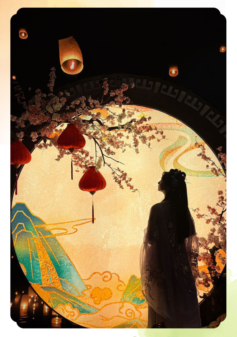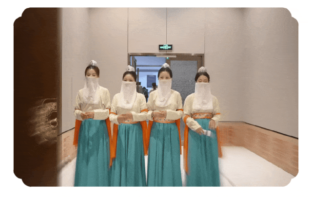 檐角挑月,丝竹萦绕,遮面侍女盈盈行礼,宾客们步入场馆刹那,仿佛踏进一幅流动的时空画卷。