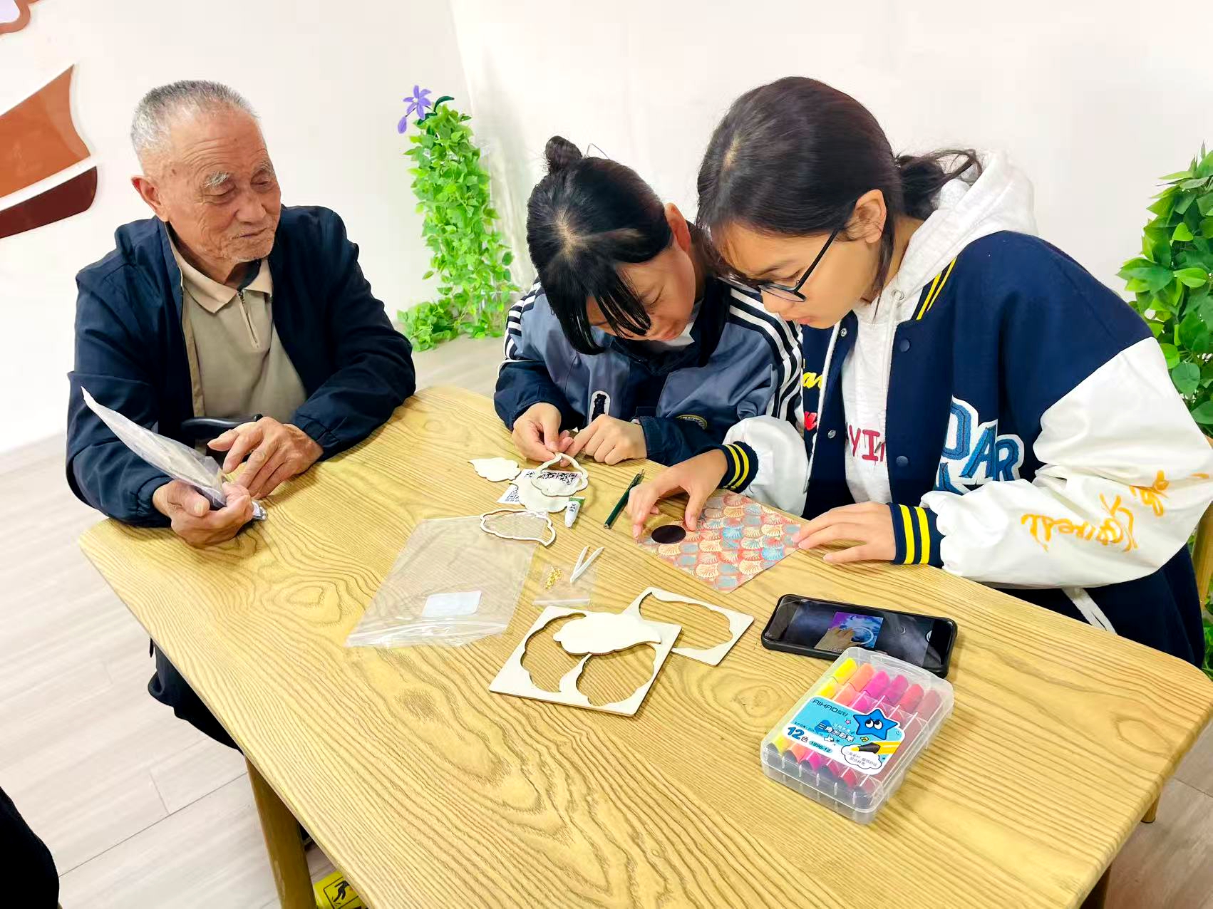 手工制作环节是活动的核心亮点。互动中,老人们分享着过去的重阳故事,孩子们叽叽喳喳说着学校趣事,原本安静的手工区,成了传递温情的小天地。遇到动手不便的老人,孩子们会及时上前协助扶稳材料,确保能顺利完成作品,当一个个冰箱贴逐渐成型,孩子们举着成品向老人展示,脸上满是成就感。