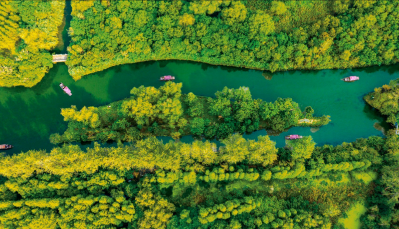 兴化先民因地制宜、创造性地开发了“垛田”这一全新的农业生产模式,2014年,该系统被联合国粮农组织确定为全球重要农业文化遗产。2022年,兴化垛田灌排工程体系又成功入选第九批世界灌溉工程遗产名录。世界级“双遗产”的盛誉,正是人与自然和谐共处的缩影。市民游客可乘乌篷船穿行于垛田水道,看花影倒映碧波,听船娘哼唱里下河小调,感受“船在水中游,人在画中行”的诗意。