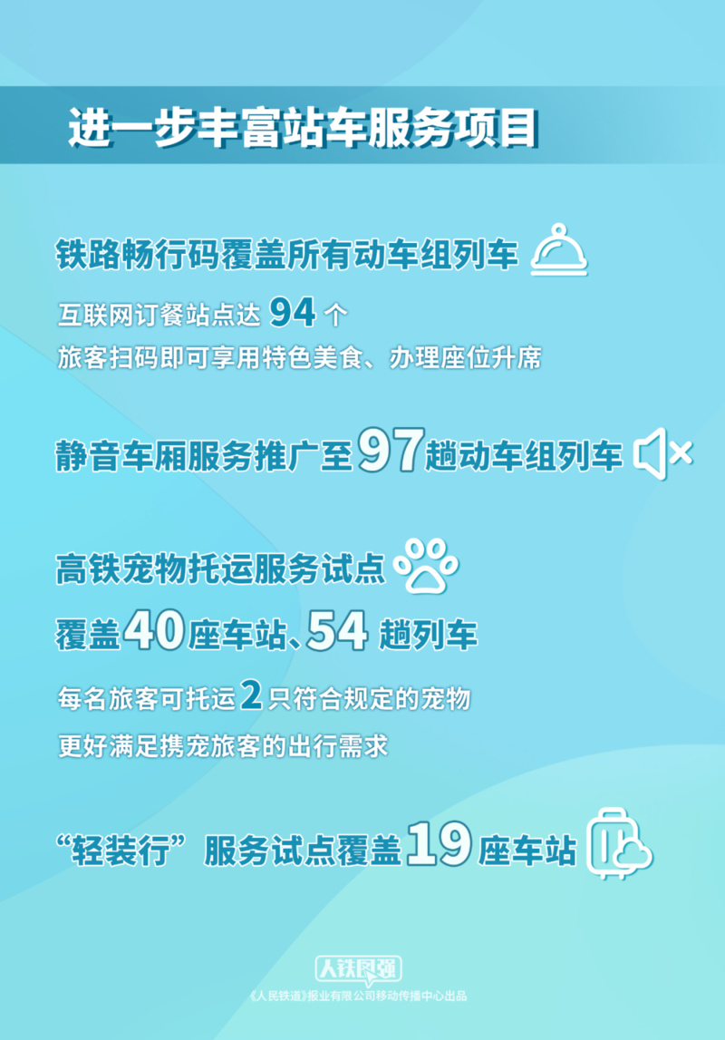 八是进一步丰富站车服务项目。铁路畅行码覆盖所有动车组列车,互联网订餐站点达94个,旅客扫码即可享用特色美食、办理座位升席;静音车厢服务推广至97趟动车组列车;高铁宠物托运服务试点覆盖40座车站、54趟列车,每名旅客可托运2只符合规定的宠物,更好满足携宠旅客的出行需求;“轻装行”服务试点覆盖19座车站,为旅客提供“门到站”“站到门”同城行李搬运服务,有效减轻旅客出行负担。
