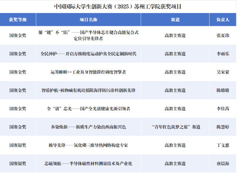 10月12日-15日,中国国际大学生创新大赛(2025)总决赛现场赛在郑州大学落下帷幕。苏州工学院共斩获国赛金奖6项、银奖2项,获奖总数、金奖总数均创历史新高,金奖数与清华大学、华南理工大学和四川大学并列全国第十一。本次比赛是学校师生首次代表“苏州工学院”出征,首次实现高教主赛道金奖“零”突破,同时,也实现了红旅赛道连续三年金奖不断线。