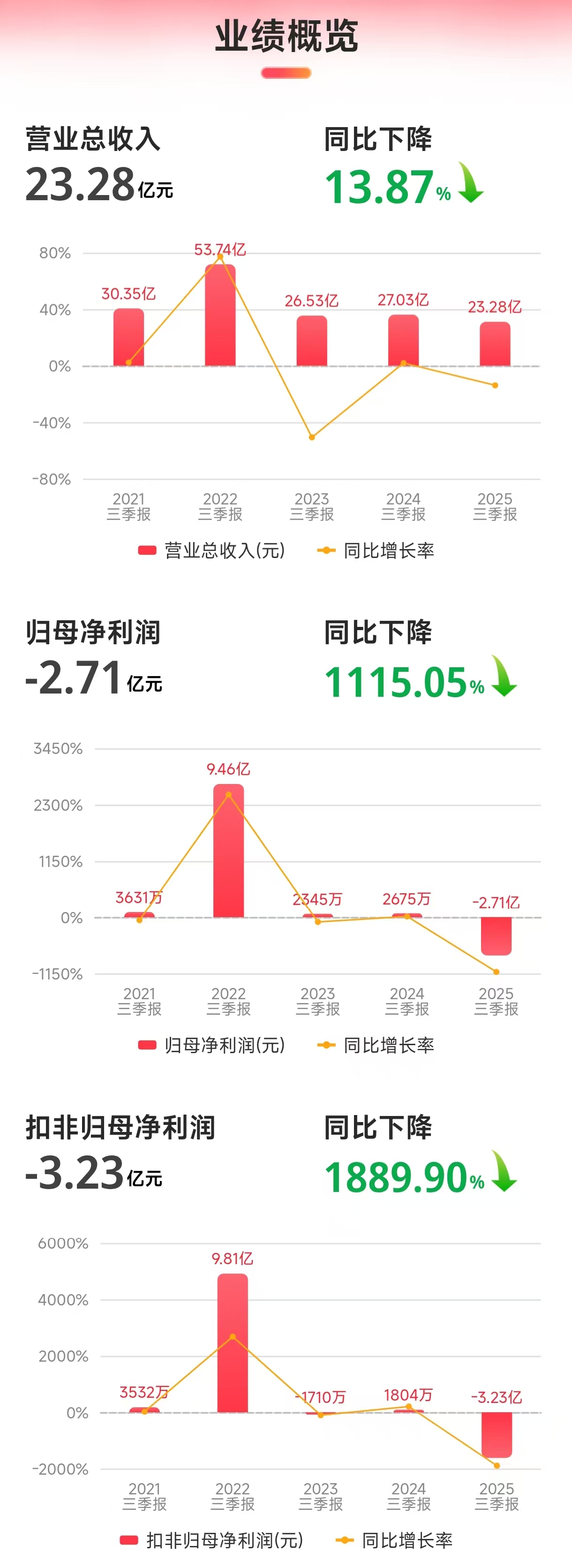 新华日报财经讯 10月28日晚间,A股上市公司红太阳(000525.SZ)披露2025年三季报。报告显示,公司前三季度实现营业总收入23.28亿元,同比下降13.87%;归属于上市公司股东的净利润为-2.72亿元,与上年同期盈利2674.75万元相比,由盈转亏,同比大幅下降1115.05%;扣除非经常性损益的净利润为-3.23亿元,同比下降1889.90%。公司的综合毛利率为7.41%,较上年同期下降18.06个百分点;加权平均净资产收益率为-9.64%。值得注意的是,公司在2025年第一季度实现盈利后,于第二季度出现大幅亏损,导致上半年整体亏损2.08亿元。第三季度单季,公司归母净利润再次亏损6306万元。