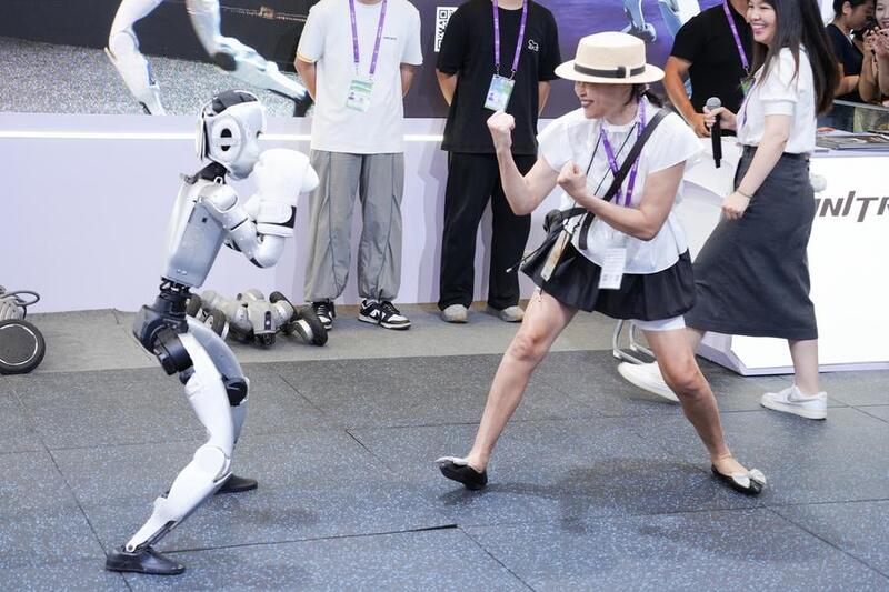 A humanoid robot performs boxing with a visitor at the Nanning International Convention and Exhibition Center in Nanning, capital of south China's Guangxi Zhuang Autonomous Region, Sept. 19, 2025. (Xinhua/Zhou Tinglu)