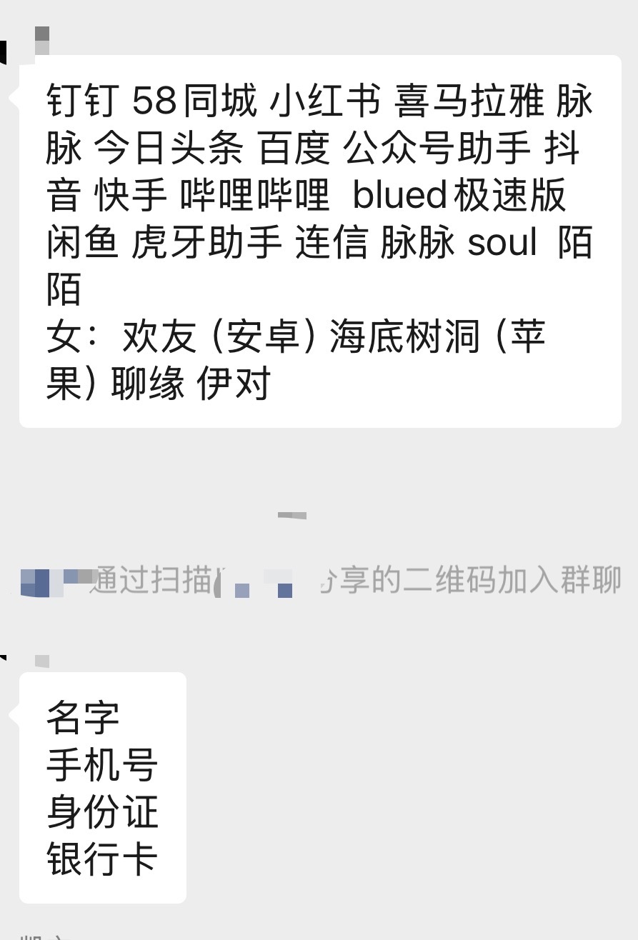 “先下载一下这些App。”说着,记者所在小组的组长将一堆App的名字发在临时组建的群里,还要求大家将自己的姓名、手机号、身份证号、银行卡号等个人信息也发到群里。一上来就先要个人信息?面对大家的疑问,组长解释,有些应用需要提前将信息发给应用方才能申办,还可以节省时间。“能私发给你吗?”记者尝试询问,组长则干脆称,“信息不会被扩散出去,都是安全的。”记者尝试添加该男子的个人微信,被提醒该账号违反了平台规定,无法添加好友,无奈只能“照猫画虎”,在群内上交了自己的个人信息。