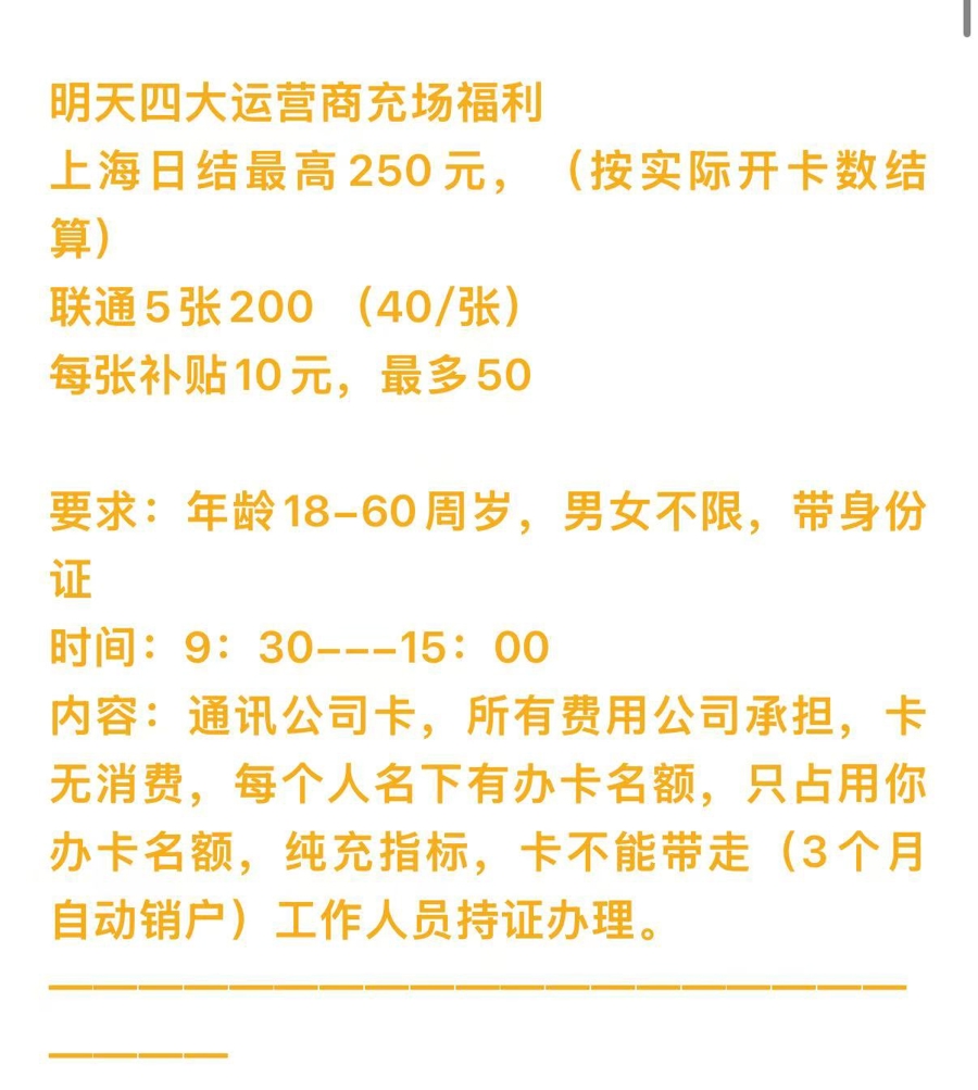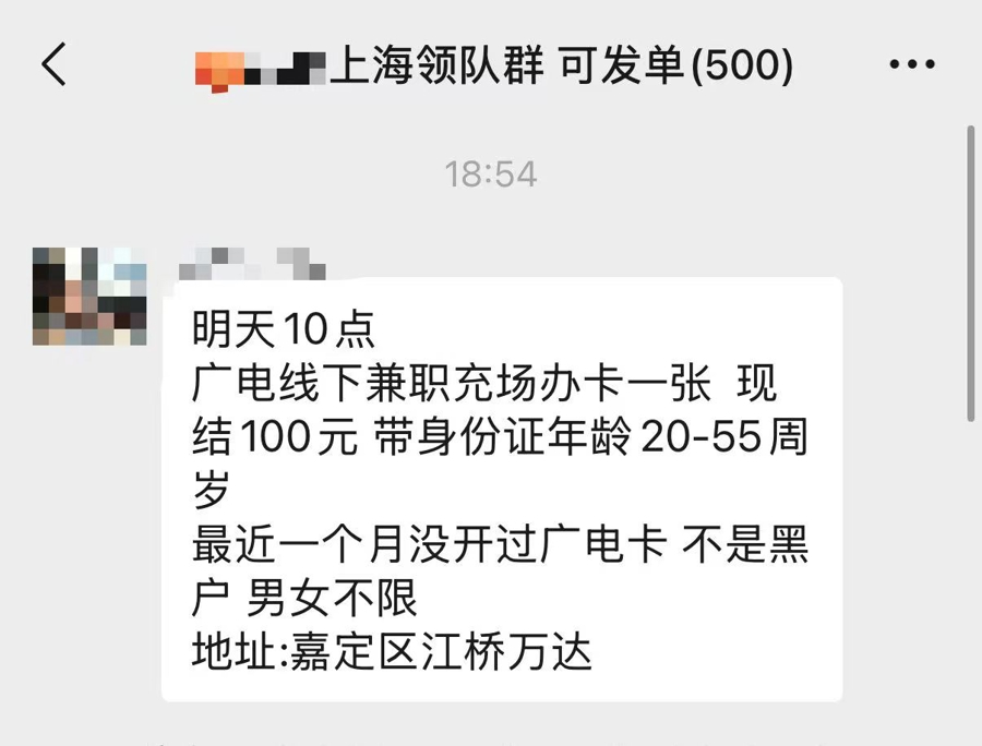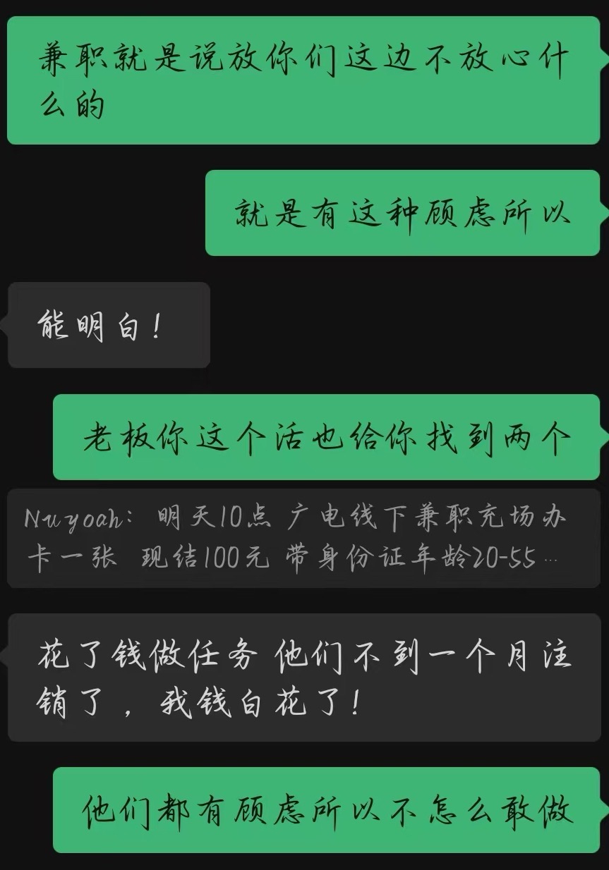 记者看到,群内有个领队发布了“广电卡充场”的招募信息,便赶忙添加其询问详情。对方称,相较于其他几家运营商,办理“广电卡”的人不是很多,上海地区的工作人员没有完成任务,这才通过他们发布招聘信息。至于所谓的安全,他表示可以完全放心,“纯绿色的”。他还解释道,之所以要留卡,是因为担心求职者刚办完就注销,这样会导致冲量业绩无法完成,但绝对不会挪作他用,为了取信记者,他还发来了他和号商老板的聊天记录。在随后的交谈中,记者了解到,每成功介绍一个人给“号商老板”,他可以获得20元的佣金,而求职者也可以赚取100元的报酬,在他看来,这是“双赢”。