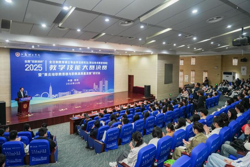 10月26至27日,2025年全国“田家炳杯”全日制教育硕士专业学位研究生(职业技术教育领域)教学技能大赛决赛暨“黄炎培职教思想与职教高质量发展”研讨会在江苏理工学院举行。全国全日制教育硕士专业学位研究生教学技能大赛职业技术教育专家组组长孟庆国、汤生玲,副组长张建荣、刘志文和邱飞岳,江苏省中华职业教育社副主任吴学敏,江苏省中华职业教育社秘书长胡恒锁,常州市教育局副局长纪忠,江苏理工学院党委副书记、校长戴国洪,党委常委、副校长王俊,研究生院、职业教育学部、炎培学院等部门负责人,职教领域专家学者及来自全国29所职教硕士培养高校的参赛领队、指导教师和参赛选手参加活动。