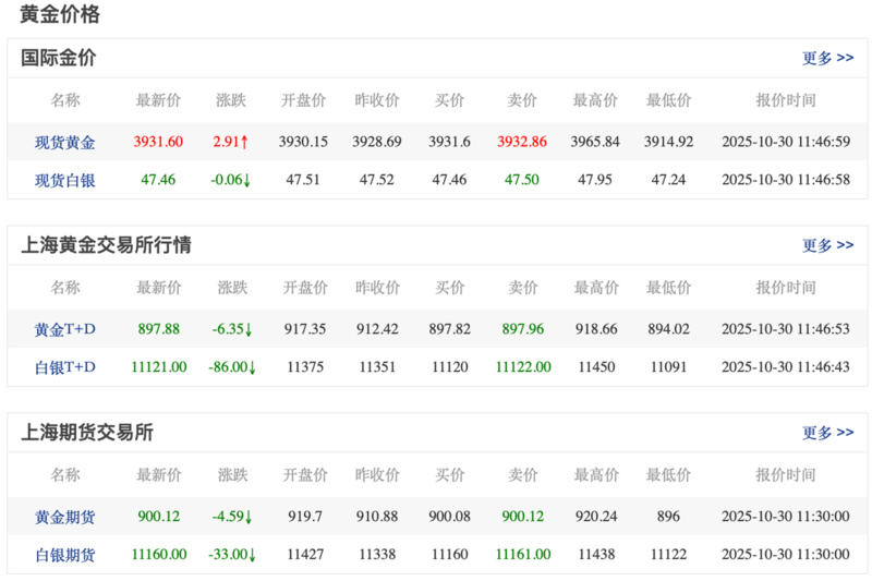交汇点讯 10月30日早盘接近12时附近,国内现货黄金报价跌破900元/克关口,最低报895.30元/克,跌1.93%。同时,今早国内各大珠宝品牌足金饰品也进行了价格下调,最低降至1122元/克。目前国际黄金现货报价,盘中最低至3927.09美元/盎司。
