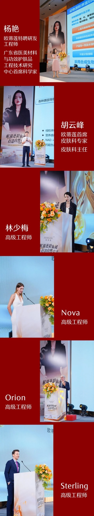 发布会上名仕云集,欧蒂莲特聘研发师、博士生导师、科学家--杨艳博士;欧蒂莲首席皮肤科专家、皮肤科主任--胡云峰;高级工程师--林少梅、Nova、Orion、Sterling,欧蒂莲医学美容集团海内外研发师,工程师等,在产品研发、产品升级等方面分享专业领域知识。