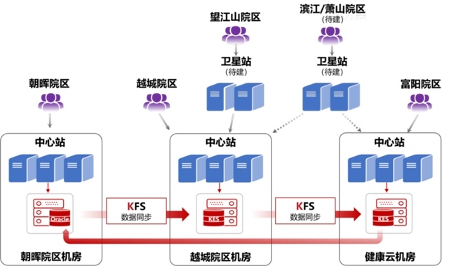 在技术架构上,该院联合电科金仓,引入异构多活方案,多院区互为主备,通过异构组网、多活容灾、多写同步和卫星方案等技术创新,彻底改变了浙江省人民医院此前面对数据安全的被动局面。目前浙江省人民医院拥有朝晖院区、越城院区和富阳院区三个中心机房,各机房之间互为主备,发生故障无需手动拉起灾备系统,可以实现秒级切换,帮助医院实现RTO≤10min、RPO=0的容灾目标,有效提高了业务系统的高可用性。