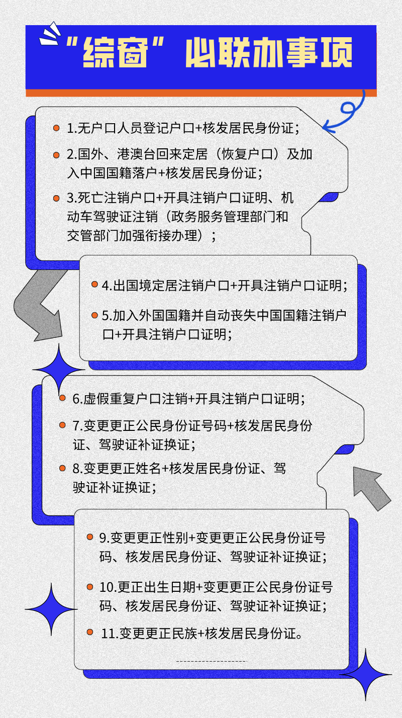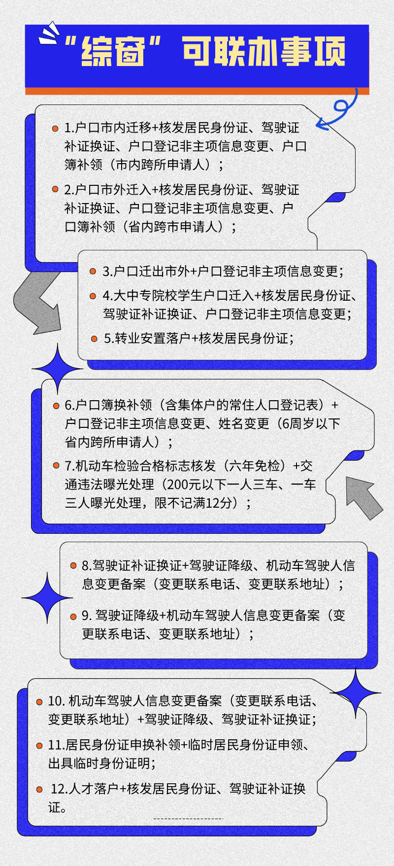第7-11项同时可联办普通护照签发(首次申请)、内地居民往来港澳通行证及签注签发(首次申请及团队旅游签注)、大陆居民往来台湾通行证及签注签发(首次申请及团队旅游签注)、户口登记非主项信息变更、开具户口登记项目信息变更证明。