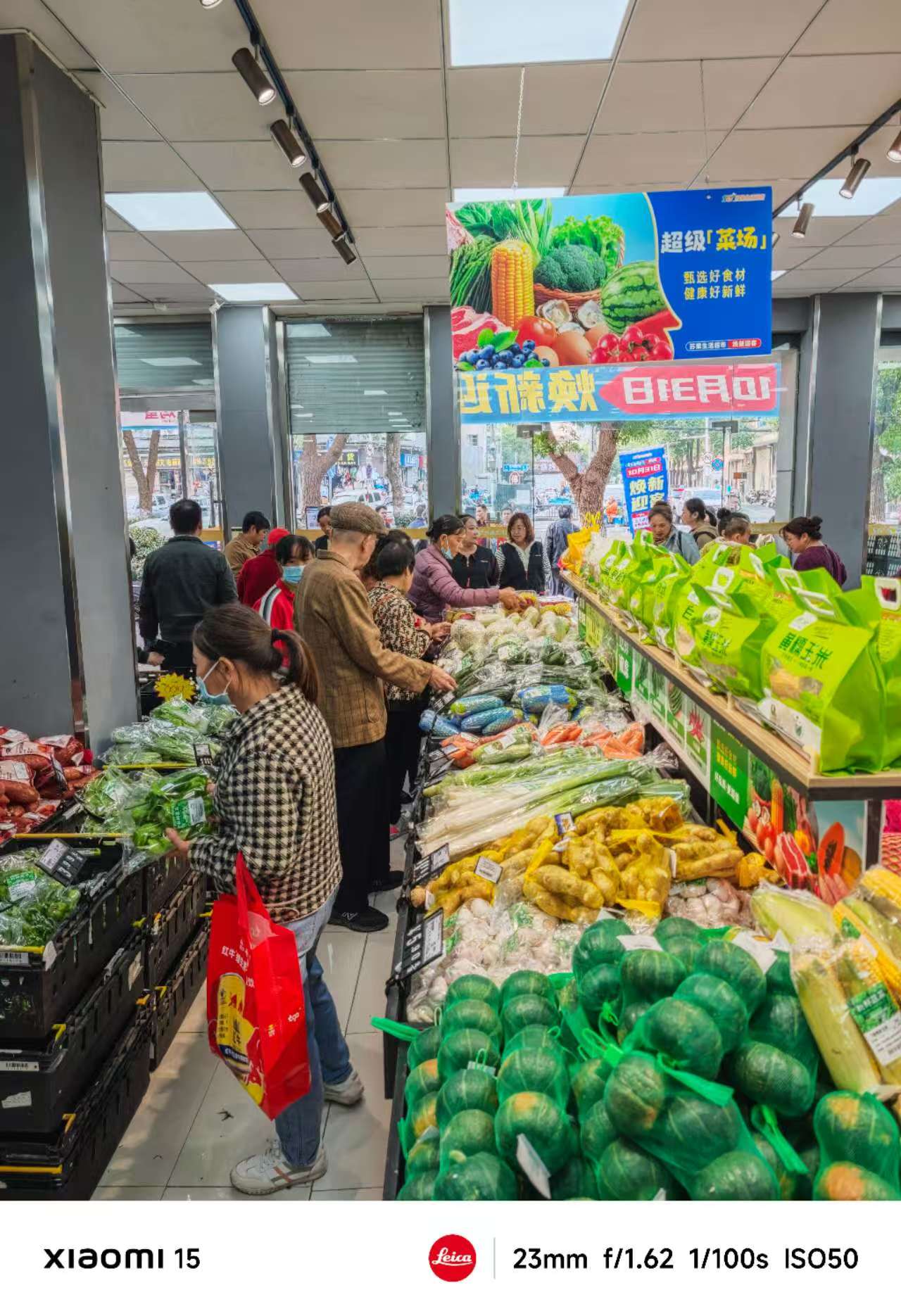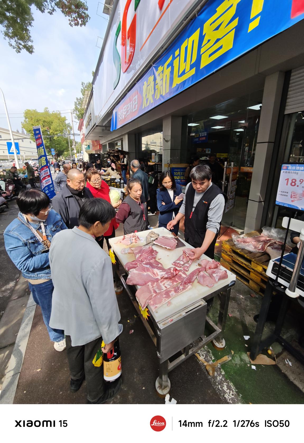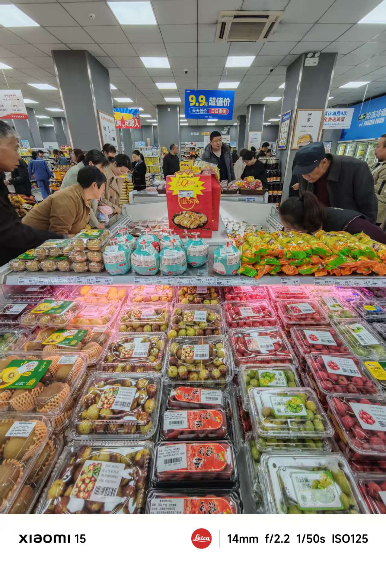在门店入口处的生鲜区,热烈的气氛尤为明显。工作人员现场切割腿肉和肋排,手起刀落间尽显新鲜品质,吸引了里三层外三层的居民驻足围观、询价购买。“这腿肉看着就新鲜,才7.9元一斤,今天得多买点!”一位正在排队的顾客高兴地说。果蔬区同样色彩绚丽、人头攒动,饱满鲜亮的小番茄、蓝莓、大枣、猕猴桃等琳琅满目,顾客们推着购物车精心挑选,勾勒出一幅充满烟火气的民生画卷。