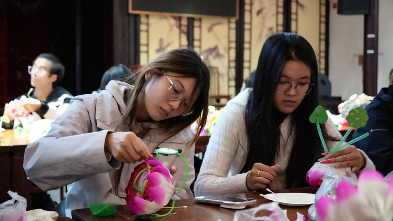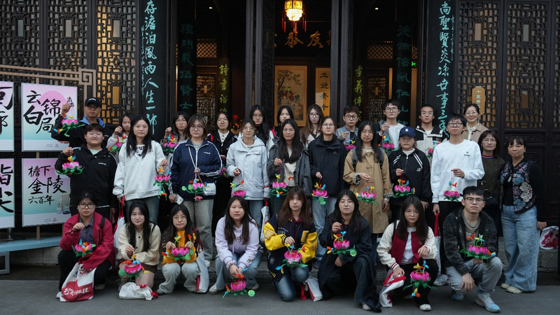 在曹老师的悉心示范和指导下,同学们兴致盎然地动手实践,亲手制作起最具代表性的南京非遗手工——荷花灯。沉浸式的体验不仅让同学们感受到了传统手工艺的独特魅力,更对非遗代表性传承人所付出的坚守与努力肃然起敬。大家围绕非遗项目在当代社会的生存现状、保护措施以及如何借助现代科技与创意实现活化利用等话题,与曹老师展开了热烈讨论,深刻认识到文化传承并非固步自封,而是需要在创新中延续生命活力。
