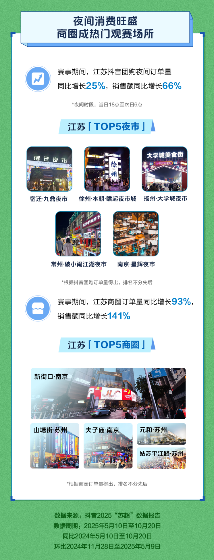 交汇点讯 10月31日,抖音生活服务发布《2025“苏超”数据报告》。报告显示,5月10日至10月20日,抖音“苏超”相关内容累计播放370亿次,获赞超4.3亿次,分享超1.1亿次,评论超7133万次。赛事期间,江苏全省抖音团购订单量同比增长24%,销售额同比增长68%,用户消费力比去年显著增强。赛事热梗出圈不断,全面带动江苏各城市美食、文旅、休闲娱乐消费,各地烟火小店、商圈生意增长,夜经济旺盛。