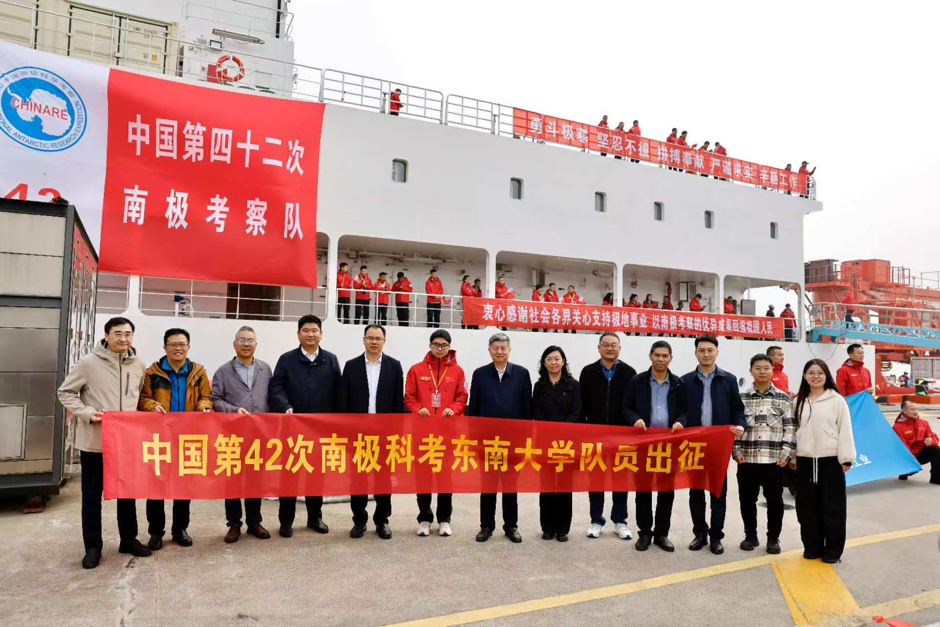 出发前,中国工程院院士、东南大学校长孙友宏在现场向许银辉授旗,并亲切叮嘱道:“银辉,我代表学校来看望你。此次出征责任重大,希望你牢记嘱托,以东大人的担当圆满完成科考任务,更要时刻注意安全,我们等你平安归来。”东南大学副校长孙立涛,自动化学院、附属中大医院、科研院等单位相关负责人到场送行。