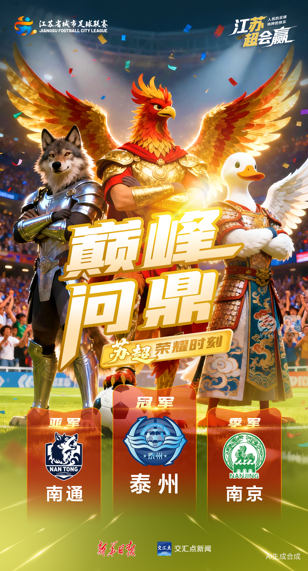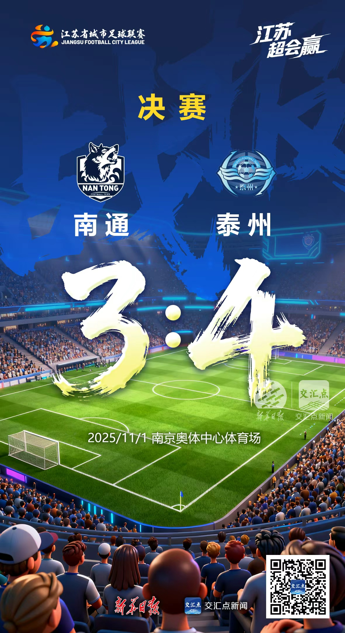 交汇点讯 11月1日晚,2025年“苏超”总决赛在南京奥体中心体育场进行,由南通队对阵泰州队。