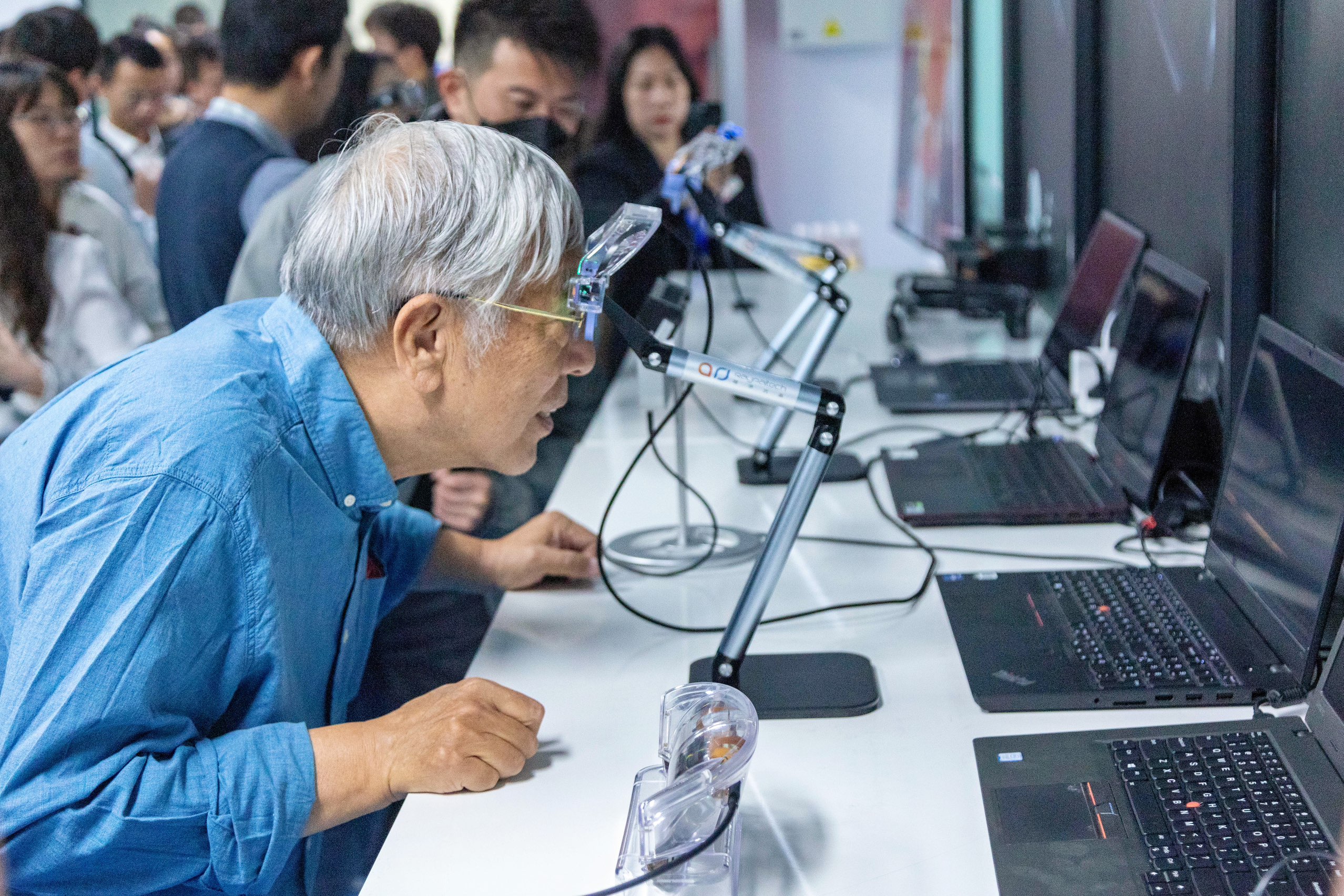 在城市的另一端,77岁的著名科幻作家、中国科幻银河奖终身成就奖得主王晋康走进理湃光晶(苏州)科技有限公司。他戴上一款AR眼镜,一幅类似电脑屏幕的界面在虚拟视野中呈现,而通过手中的“遥控器”,就能操控这台“虚拟电脑”。这一刻,他1997年的作品《七重外壳》中的场景,已经部分地化作现实。