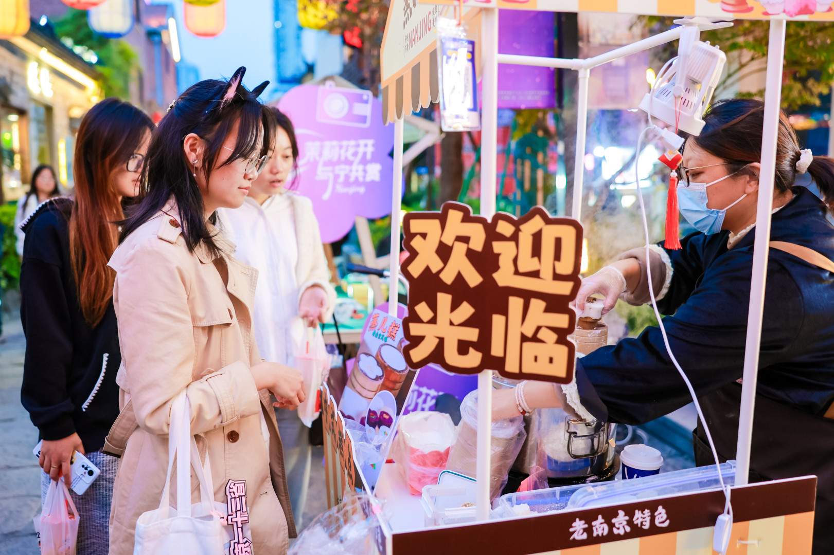 游客们或围观非遗拓印的全过程,或亲手拿起丝线体验绒花编织,“原来绒花是这么做的,太神奇了!”一位年轻游客一边跟着传承人学习编织,一边忍不住感叹。麦芽糖的甜香、蒸儿糕的软糯香气在空气中弥漫,摊主们的吆喝声此起彼伏,与市级非遗“南京吆喝”的独特韵律交织,“卖蒸儿糕咯——”高低起伏的吆喝声穿透人群,让游客仿佛穿越回老南京的市井街巷,沉浸式感受民俗风情的独特魅力。