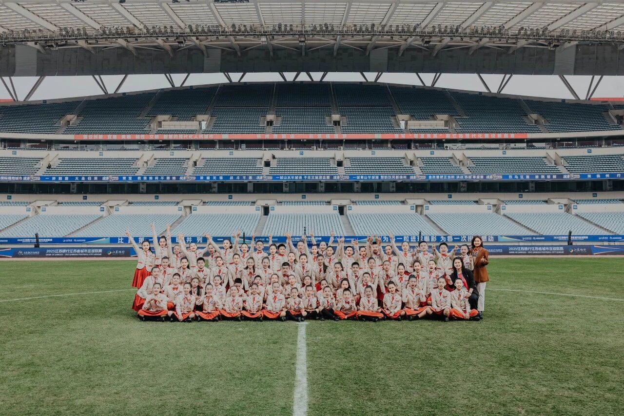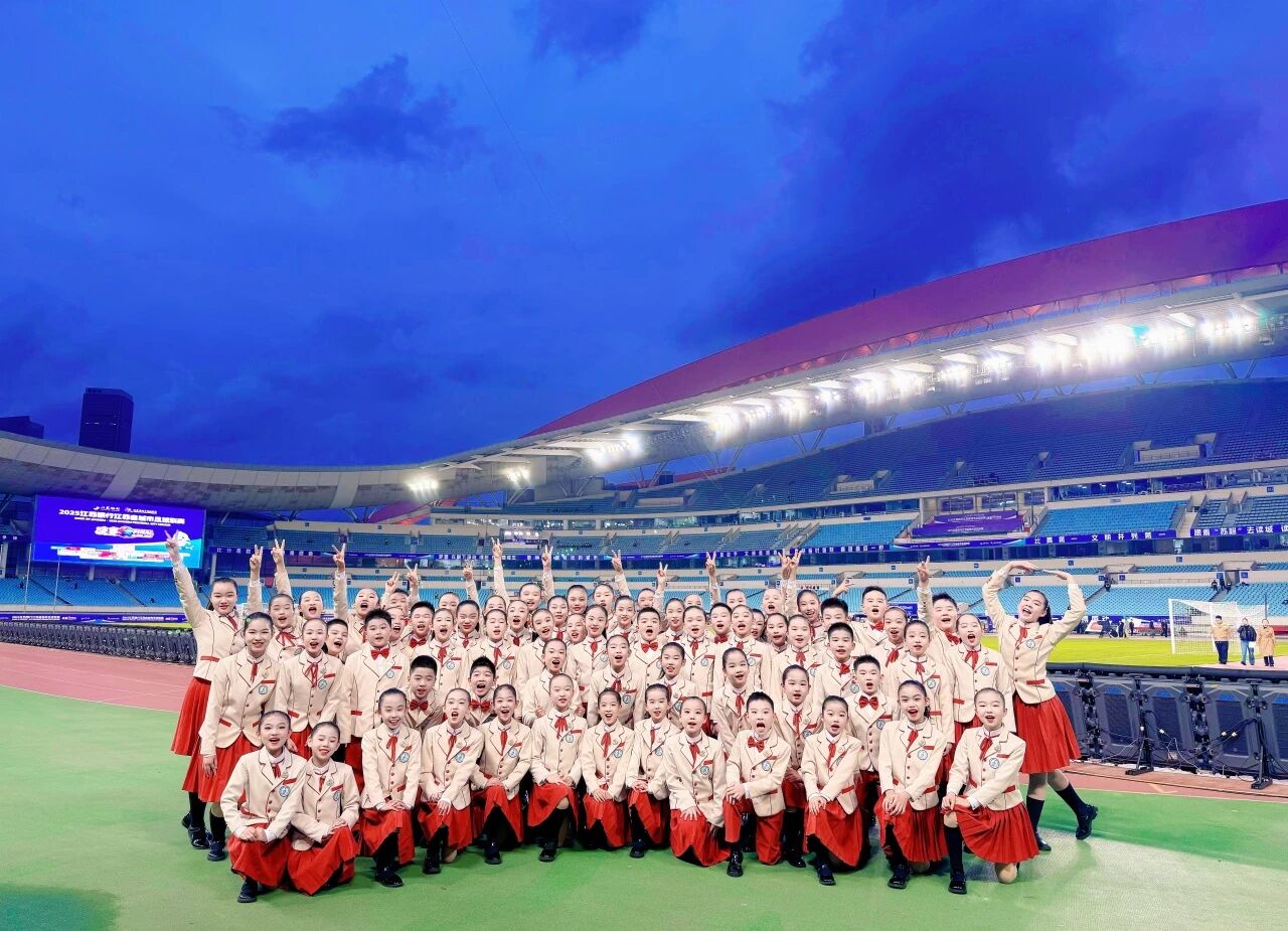 来自南京市鼓楼区天正小学天正童声合唱团的67名团员在教师谢婷的带领下,身着团服站在万众瞩目的赛场上,伴随陈洛萱同学的领唱,以清澈而充满力量的合唱深情演绎《我和我的祖国》,献礼这场体育盛会。