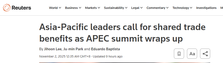 2025年亚太经合组织(APEC)领导人非正式会议于10月31日至11月1日在韩国庆州举行,会议发表了《庆州宣言》。多家外媒报道称,会议凸显了亚太地区经济体对自由贸易的承诺。