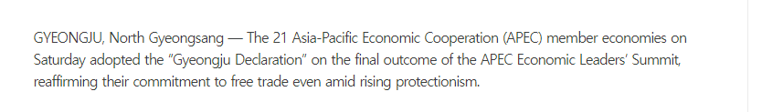 韩国《中央日报》报道称,《庆州宣言》反映出此次APEC领导人峰会的最终成果,并重申了在保护主义抬头的背景下,各成员领导人对自由贸易的承诺。