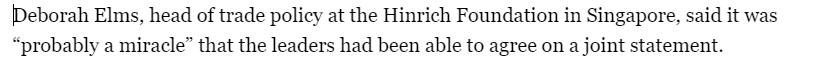 半岛电视台也关注了此次峰会,报道援引新加坡欣里奇基金会贸易政策负责人黛博拉•埃尔姆斯的话说,各成员领导人能够就联合声明达成一致是“了不起的事情”。他说,鉴于亚太经合组织经济体的不同立场,要将任何达成一致的措辞写入文件都是一项“充满挑战的工作”。