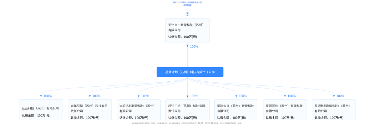 根据公开资料显示,星河问途于今年7月份注册登记,由星梦计划(苏州)科技有限责任公司(下称“星梦计划”)全资控股,而星梦计划背后的天空自由智能科技(苏州)有限公司则由追觅科技“掌舵人”之—的柏美芳担任大股东。