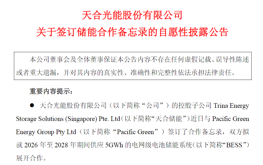 11月5日,天合储能再次发布公告,公司拟与Pacific Green拟于2026年至2028年期间建立电池储能系统供应战略合作伙伴关系,合作总容量为5GWh的储能系统。天合储能将提供其先进的电网级电池系统,该系统整合了行业领先技术,在安全性、效率与使用寿命方面均具备突出优势;Pacific Green将负责澳大利亚及其他国际市场多个项目地点的开发与项目交付工作。