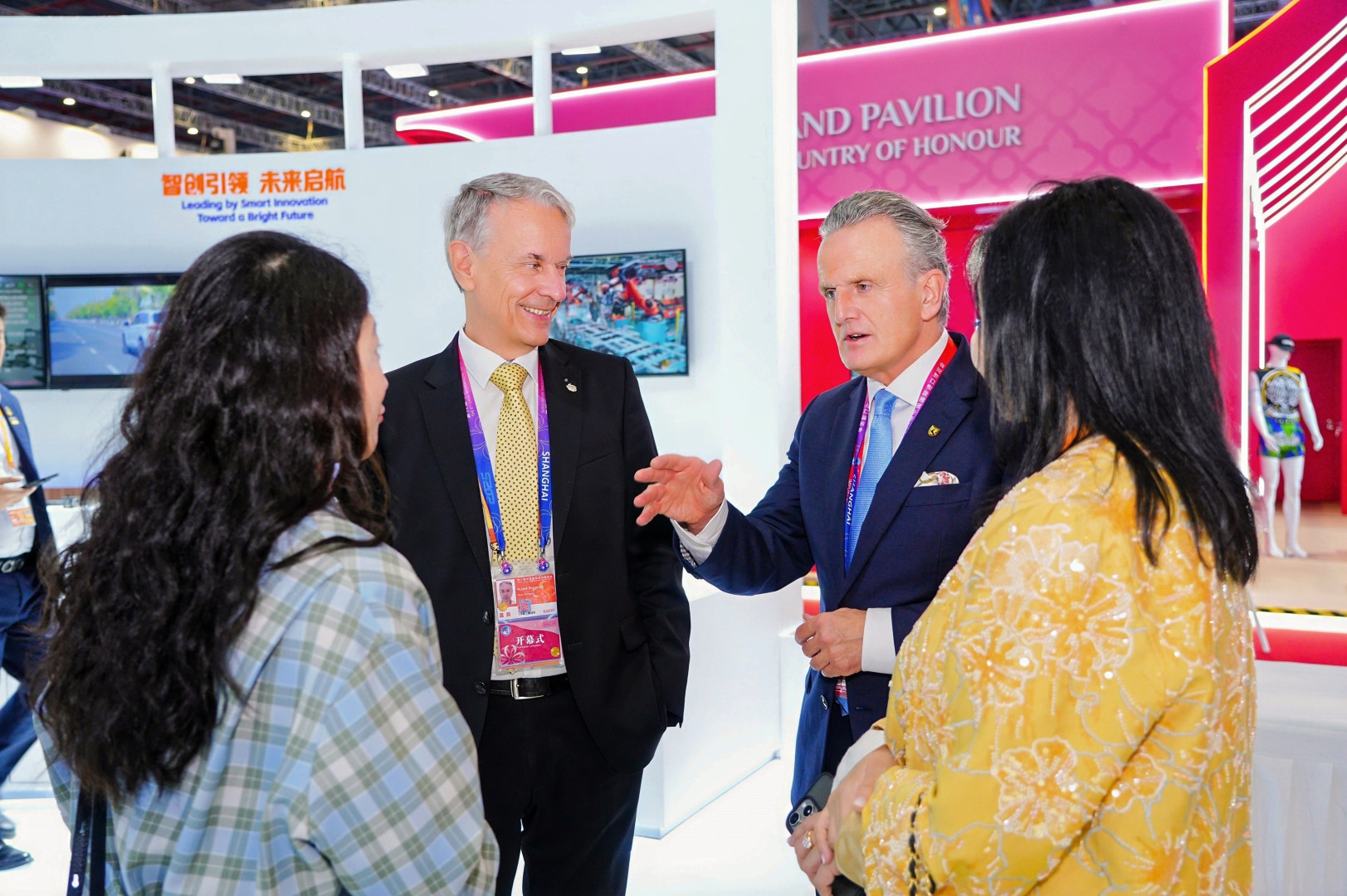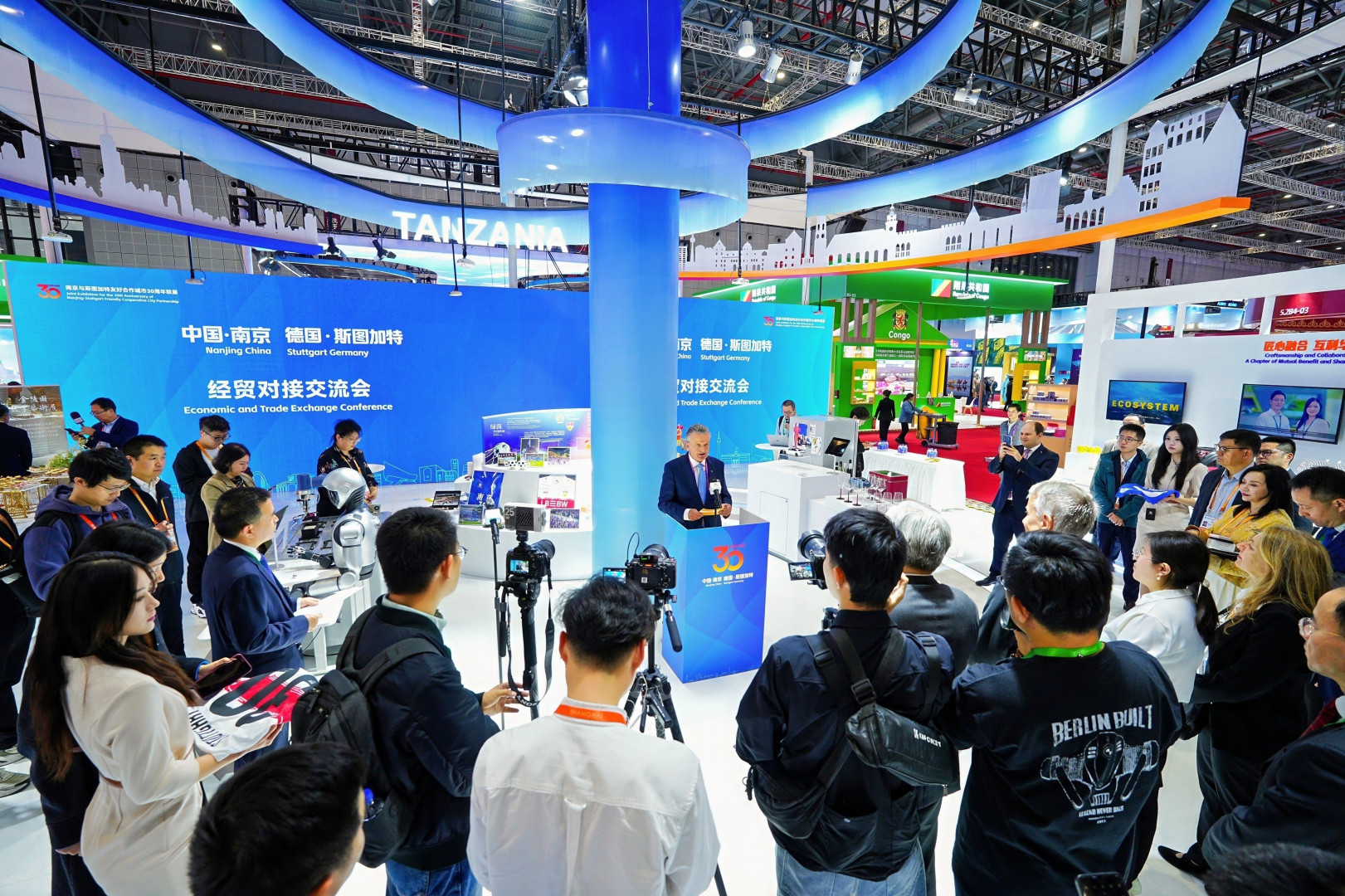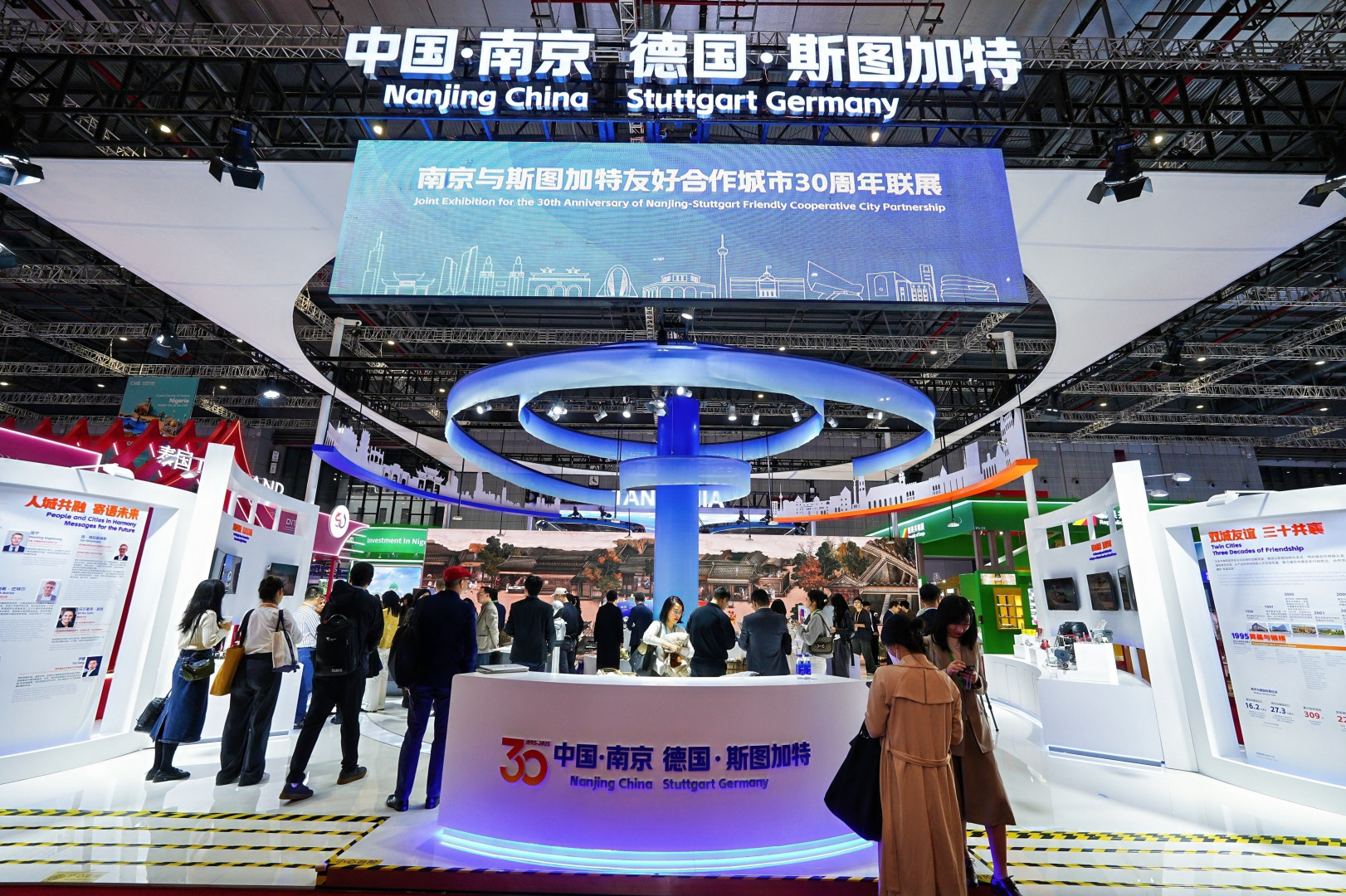 交汇点讯 11月5日,第八届中国国际进口博览会在上海国家会展中心盛大开幕。本届进博会国家馆首次设立中外友好城市展区,南京市与德国斯图加特市作为首对参展友城,联袂呈现“南京—斯图加特友好合作城市30周年联展”。展览以“双城匠心·共赢未来”为主题,通过翔实的史料、生动的案例与创新的展示,系统回顾了两市三十年来从产业协同到人文交流的丰硕成果,展现了南京以斯图加特为支点,持续推进对德合作走深走实的稳健步伐与广阔前景。