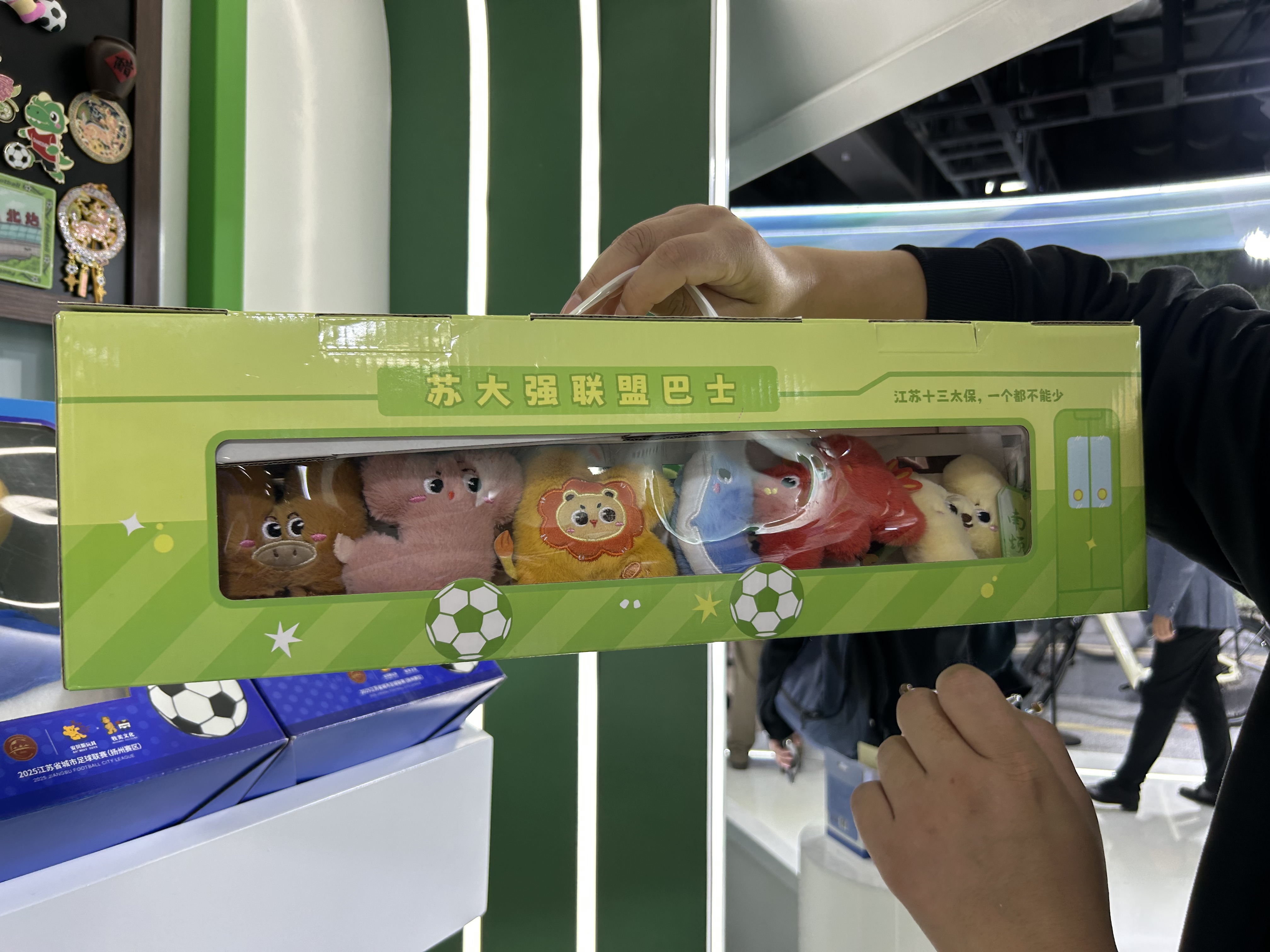 扬州安贝斯玩具有限公司此次带来“苏大强联盟巴士”,将江苏13个设区市的卡通形象钥匙扣打包在一个礼盒中,粉色的水蜜桃、橙色的大闸蟹等五彩缤纷,各有特色。“苏超”扬州足球纪念玩偶也十分接地气,小狮子以扬州狮子头为灵感,大白鹅以仪征老鹅为灵感。“今年比赛给了我们很多设计灵感,明年‘苏超’再度启动时,我们会提前布局,为消费者设计更多好玩的玩具。”公司内贸业务员秦涛说。