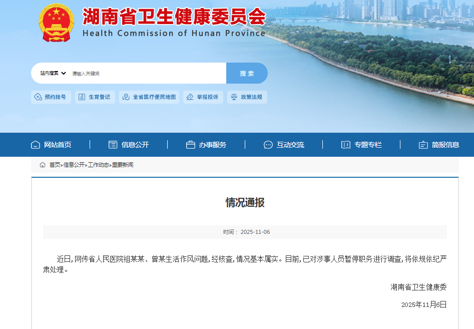 刚刚,湖南省卫生健康委发布情况通报:近日,网传省人民医院祖某某、曾某生活作风问题,经核查,情况基本属实。目前,已对涉事人员暂停职务进行调查,将依规依纪严肃处理。