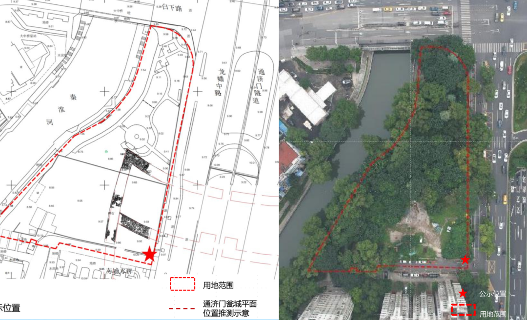 通济门遗址文物保护与展示工程位于全国文物保护单位南京城墙的保护范围、市级文物保护单位大中桥的建设控制地带、轨道交通控制保护线和内秦淮河河道蓝线控制范围内,东临通济门隧道,西临内秦淮河,南临东城水岸小区,北临大中桥。该项目用地面积6448.34平方米,规划用地性质为广场用地,绿地率>35%。