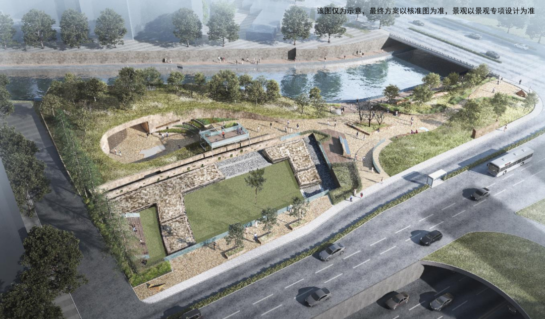 从效果图上看,整个场地西南侧将设有下沉式广场,广场上方搭建简易钢架支撑玻璃护栏空中展台,下设配套服务室,屋顶覆土与地形完美融合。面向龙蟠中路一侧展示遗址探方,让市民探索明城墙文化;面向内秦淮河一侧设置沿河台阶,让市民可亲近水岸。